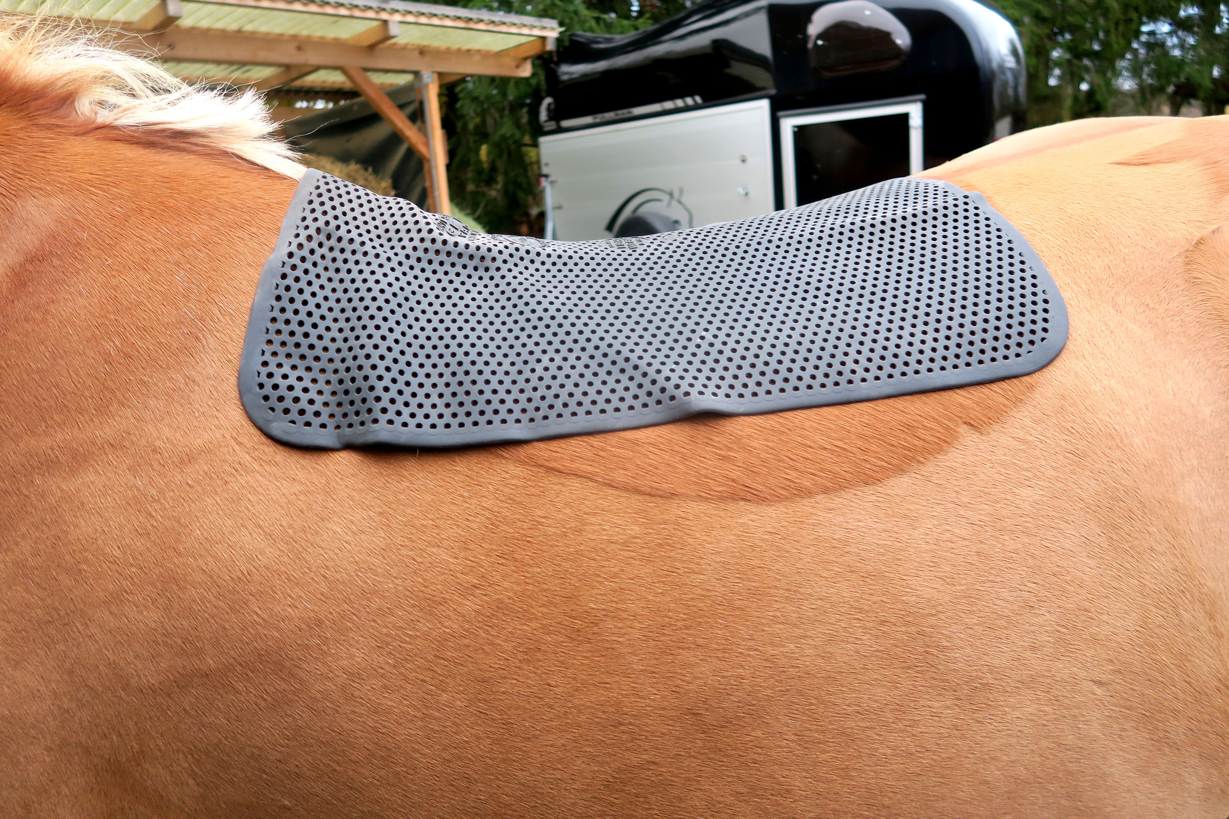 Zudem gibt es auch Schabracken und Satteldecken die im Bereich der Auflagefläche der Sattelpolster mit Moosgummi versehen sind. Wirkt einem Verrutschen des Sattels entgegen. Das Gel Pad bietet eine diskrete und jedoch stark schockabsorbierende Eigenschaft und weichen polsternden Schutz.